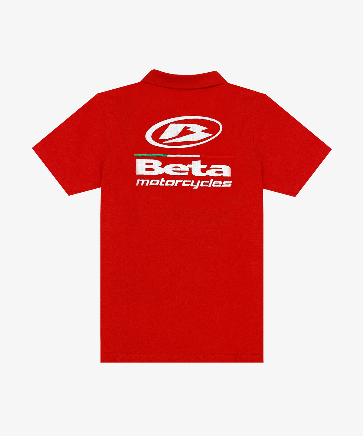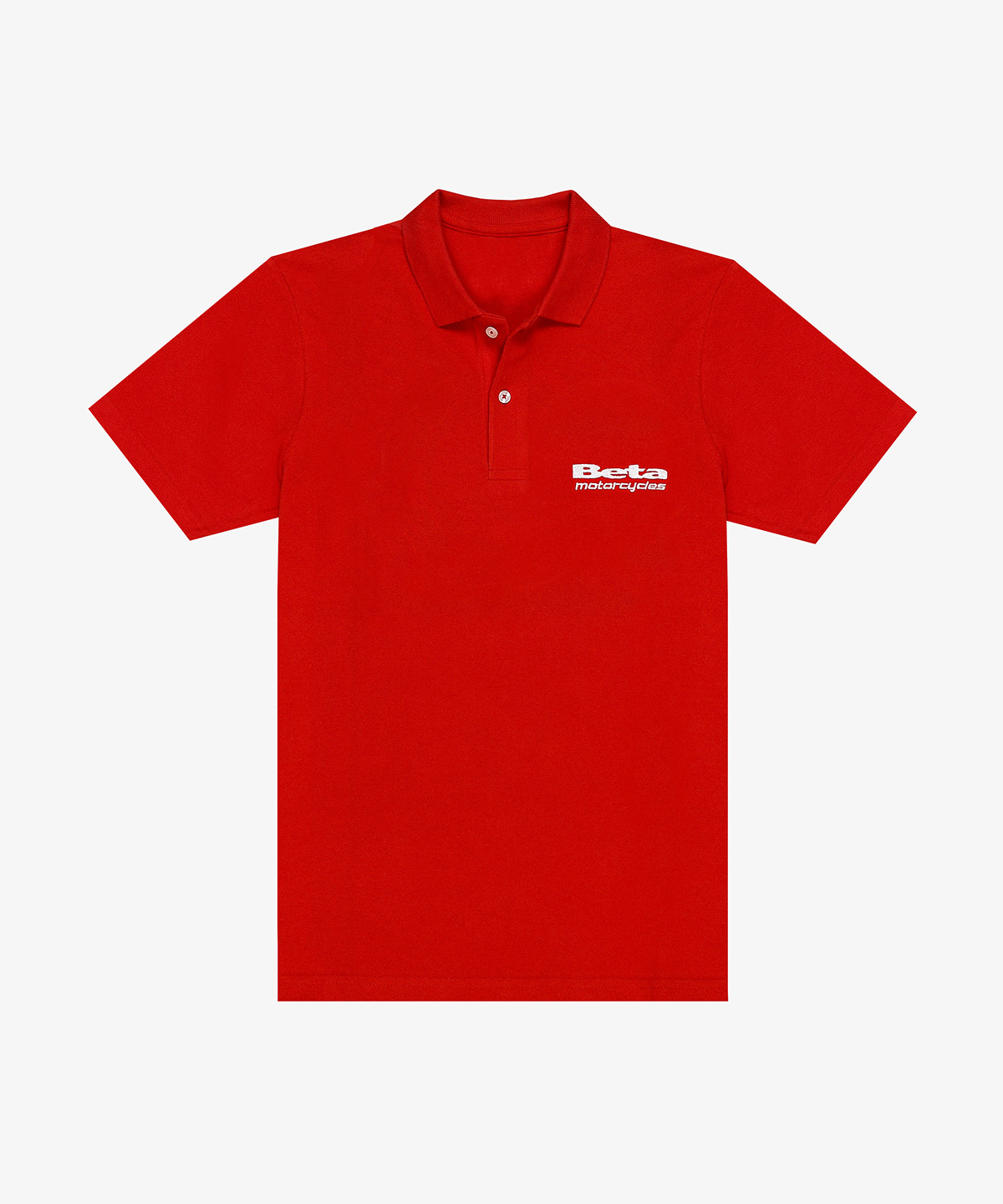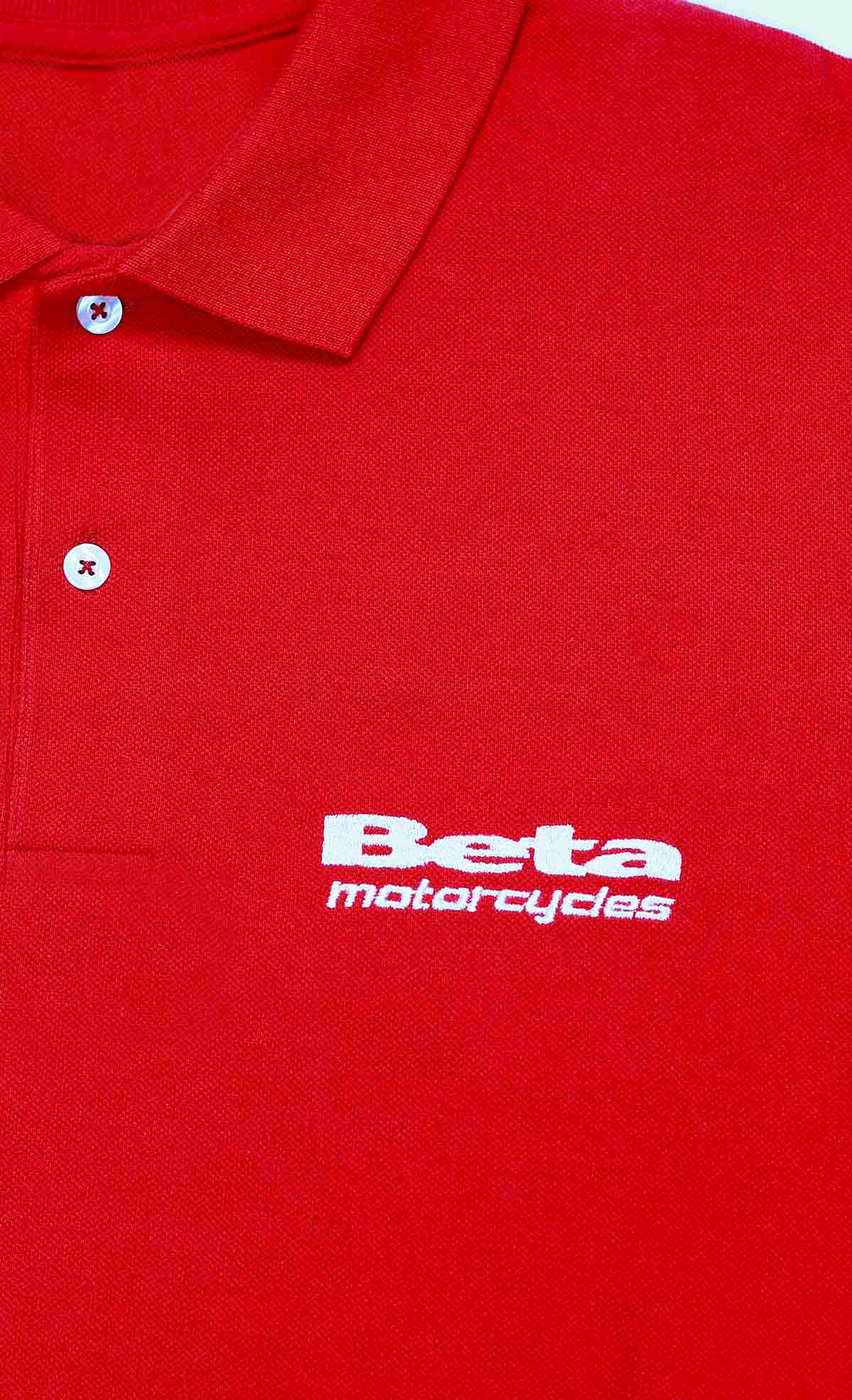 Ready made 100% cotton pique polo in red color customized with front chest and back side embroideries for a motorcycles company based in Beirut.