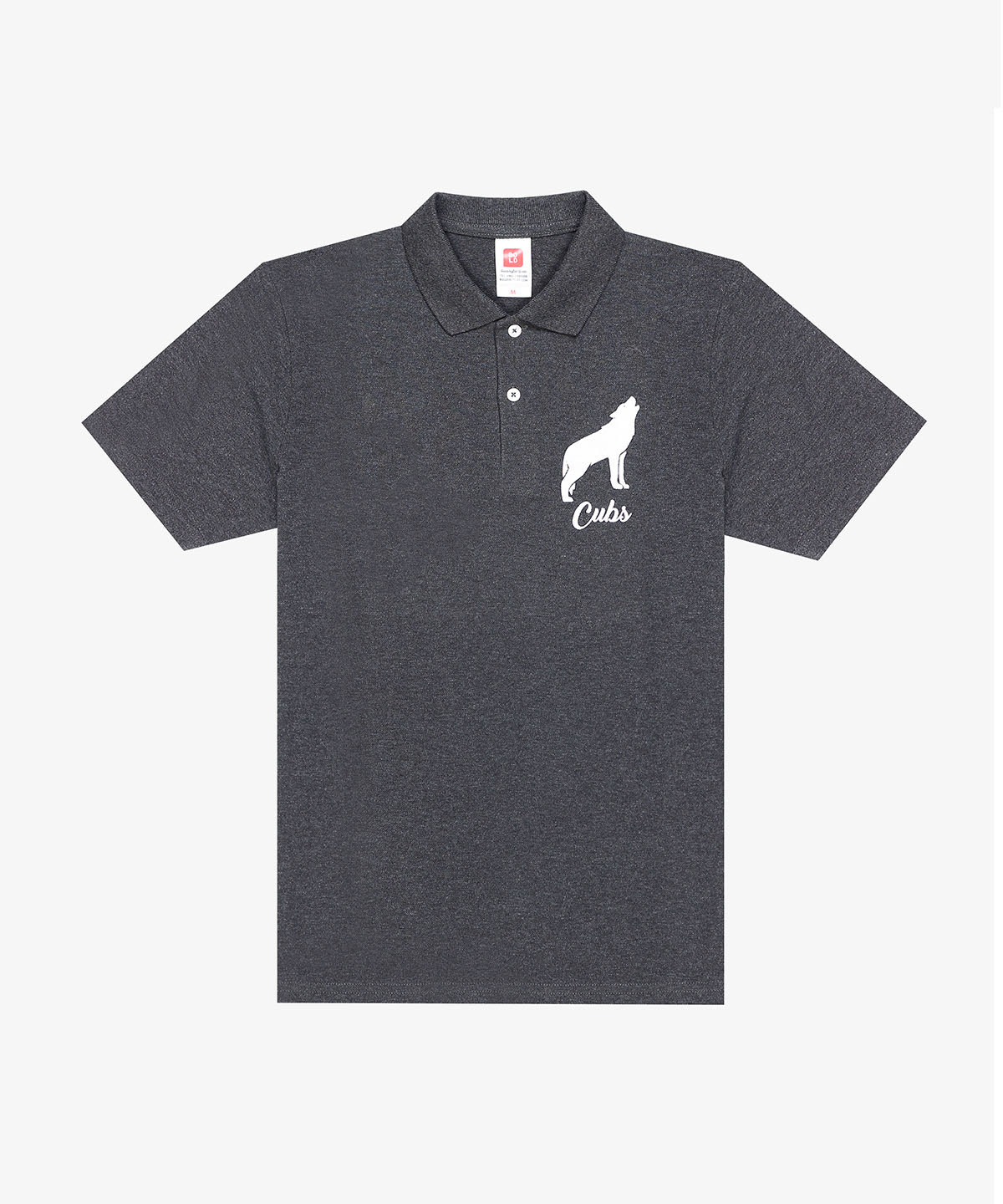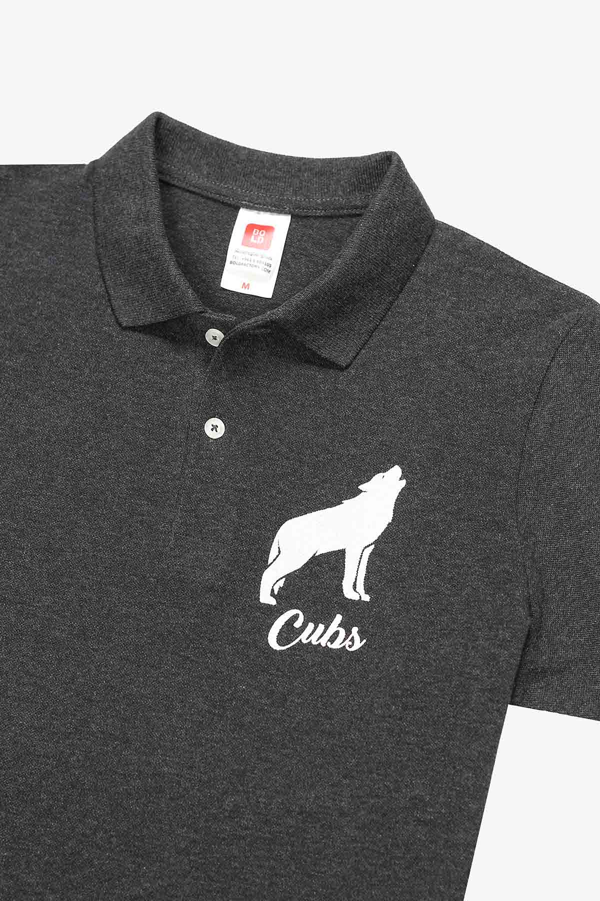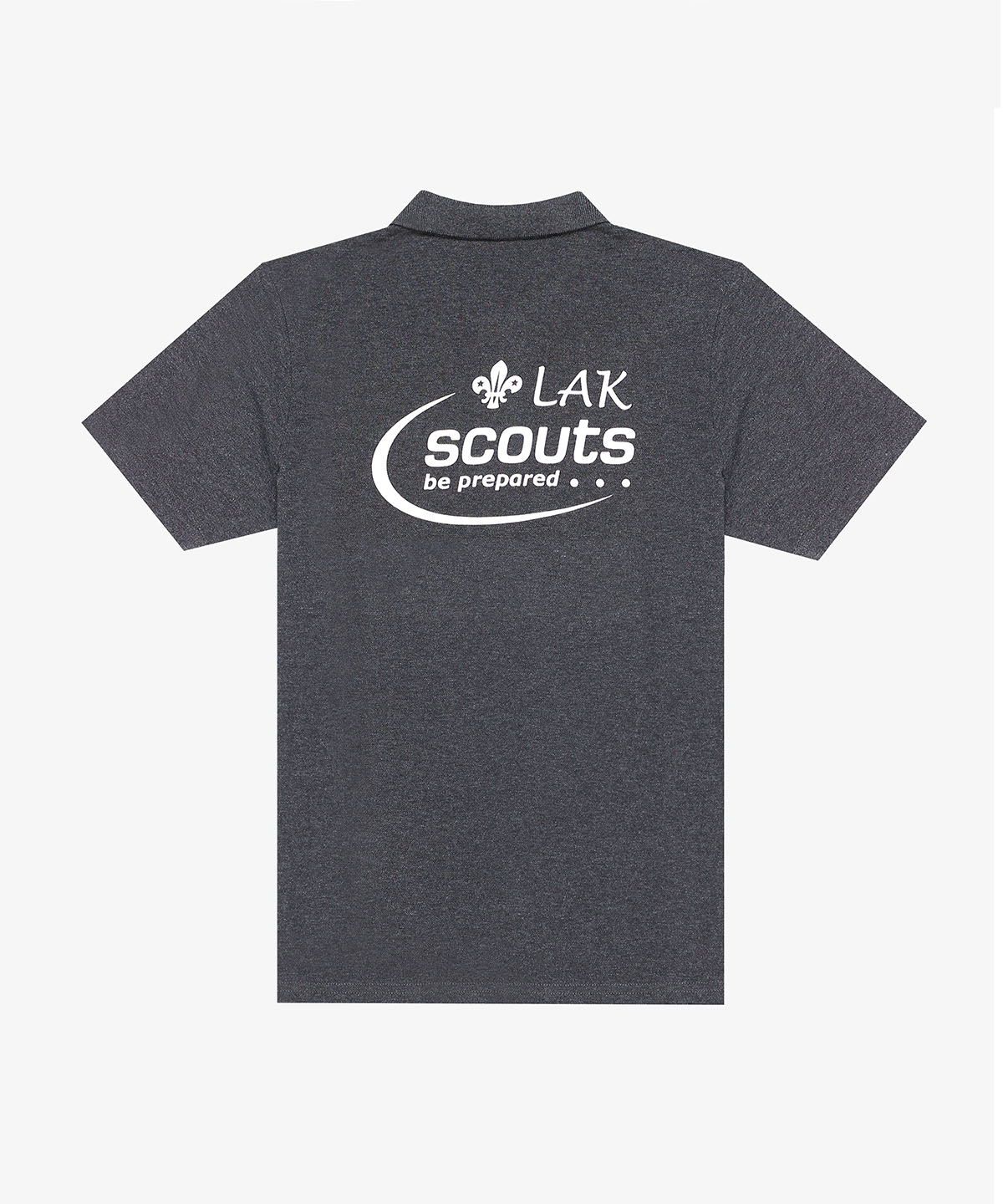 Ready made 100% cotton pique polo in dark heather grey customized with front chest and back side embroideries for a cub scouts organization based in Lebanon.