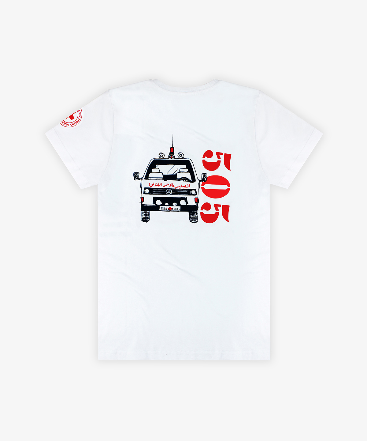 Ready made 100% heavy cotton t-shirt screen printed in 2 colors on front and back and sleeves for the Lebanese Red Cross organization.