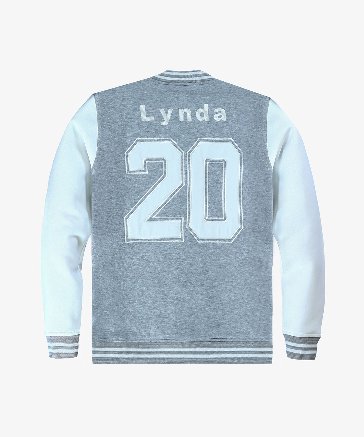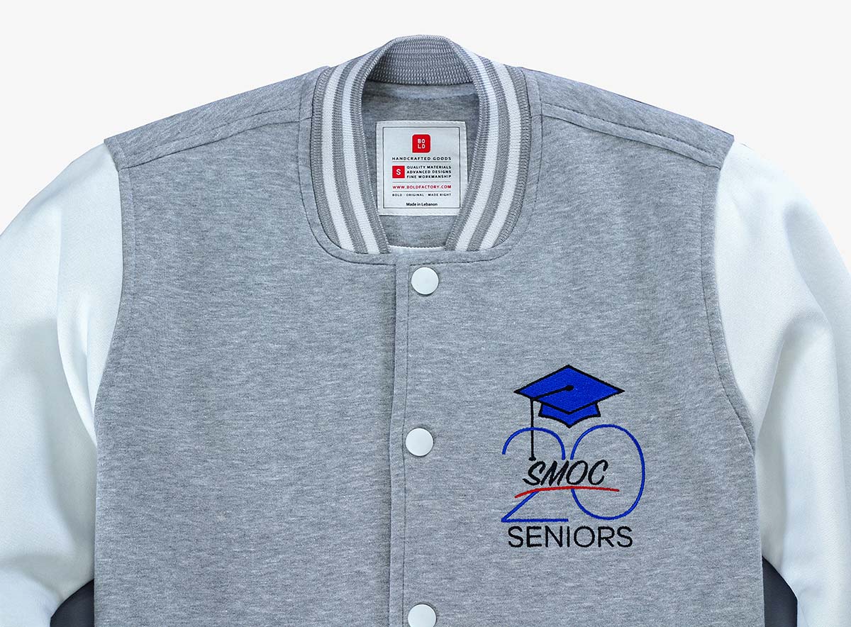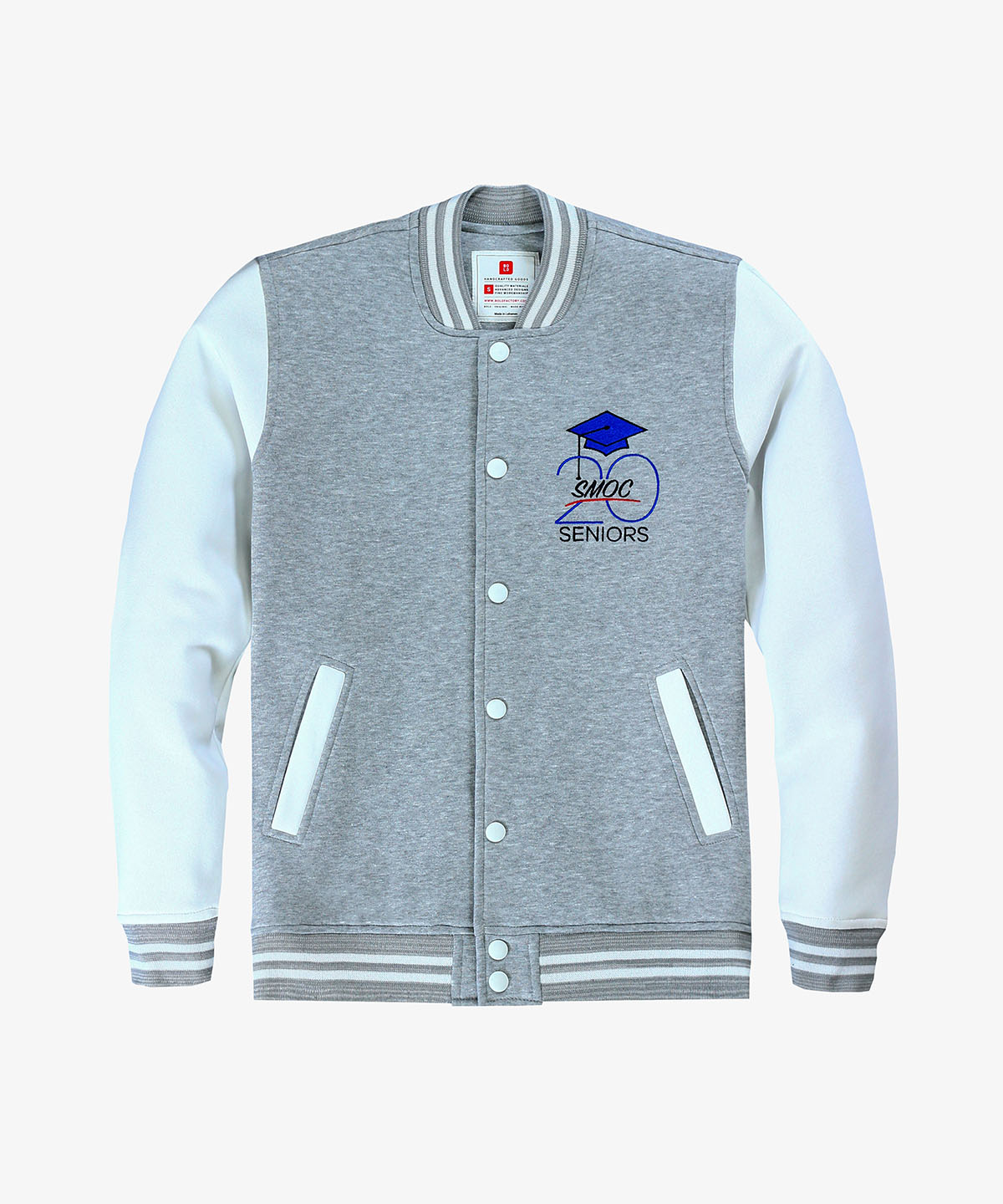 Custom made two-color fleece varsity jacket with stripped rib on cuffs and waist, high quality plastic snap buttons, and mesh lining on the inside. Front chest logo embroidery and back side year and custom student name embroidery that is different for every student.